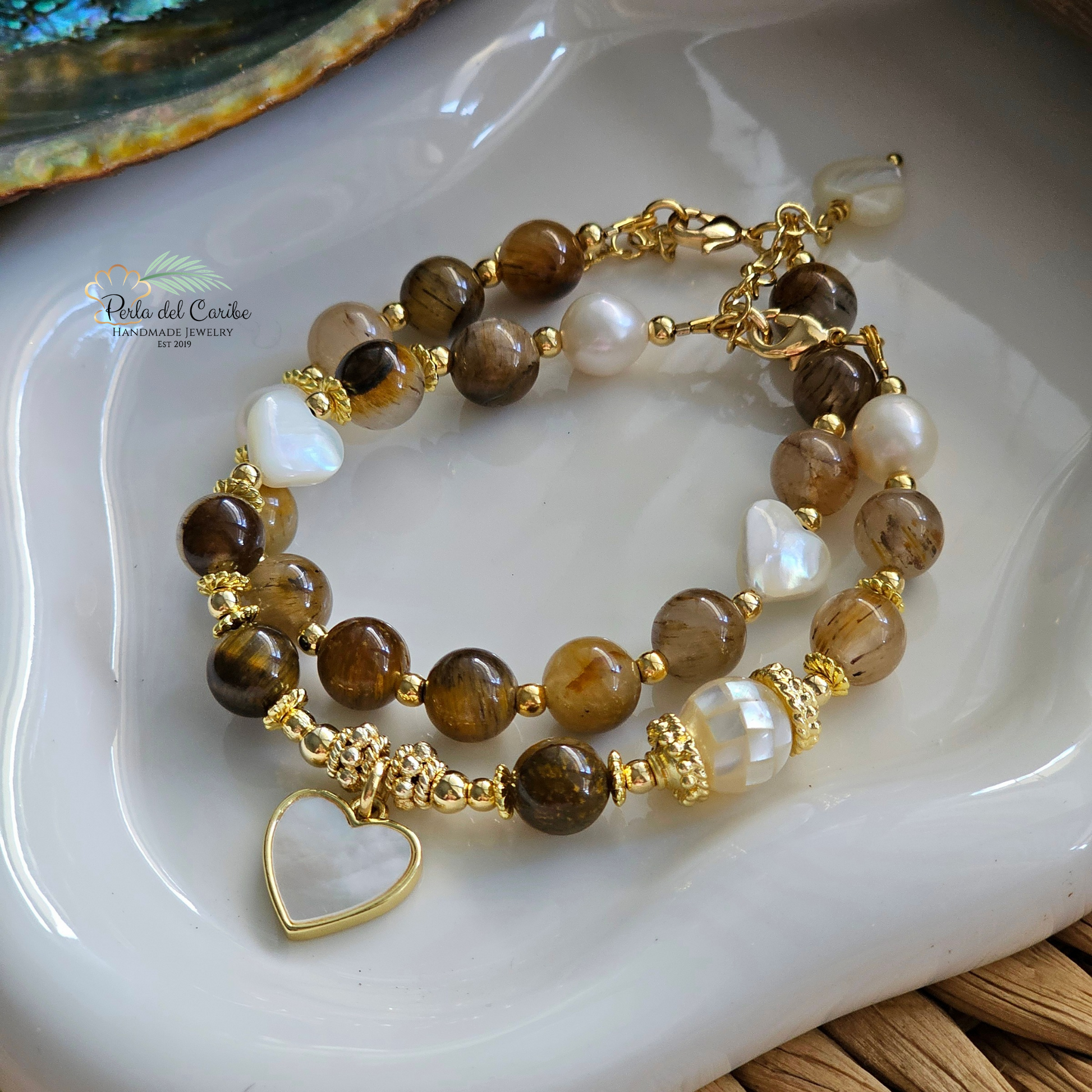 Incluye 2 pulseras. Pulsera Madre Perla Heart se vende por separado.